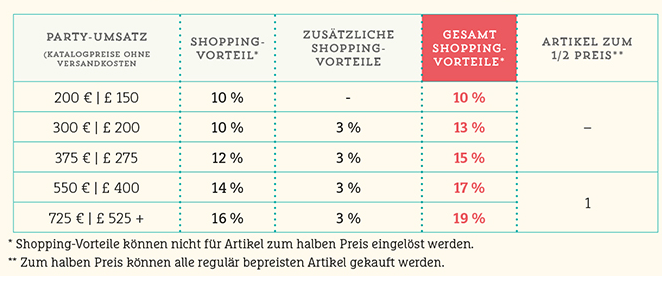 Ab einem Workshopumsatz/Stempelpartyumsatz von € 300,- erhältst du als Gastgeberin zusätzliche 3 % Shoppingvorteile, die für zusätzliche Gratisware aus den aktuellen Katalogen eingesetzt werden können.